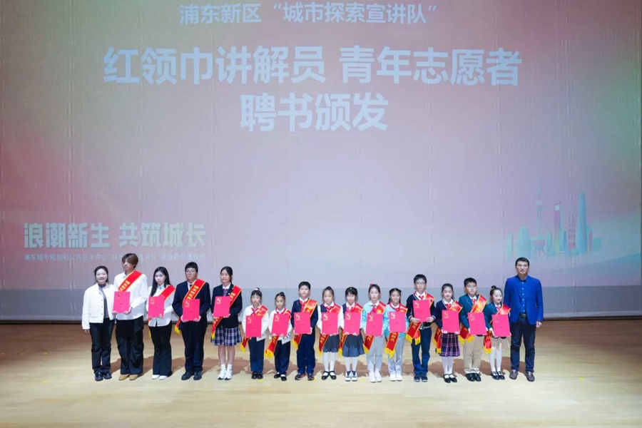 “浪潮新生 共筑城长”——浦东城市规划和公共艺术中心“城市探索宣讲队”结业典礼暨共建仪式今天举行。与此同时,由112名红领巾讲解员和15名青年志愿者组成的浦东新区第二期“城市探索宣讲队”正式启程,未来将有越来越多的青少年投身于城市文化的传播与实践之中。