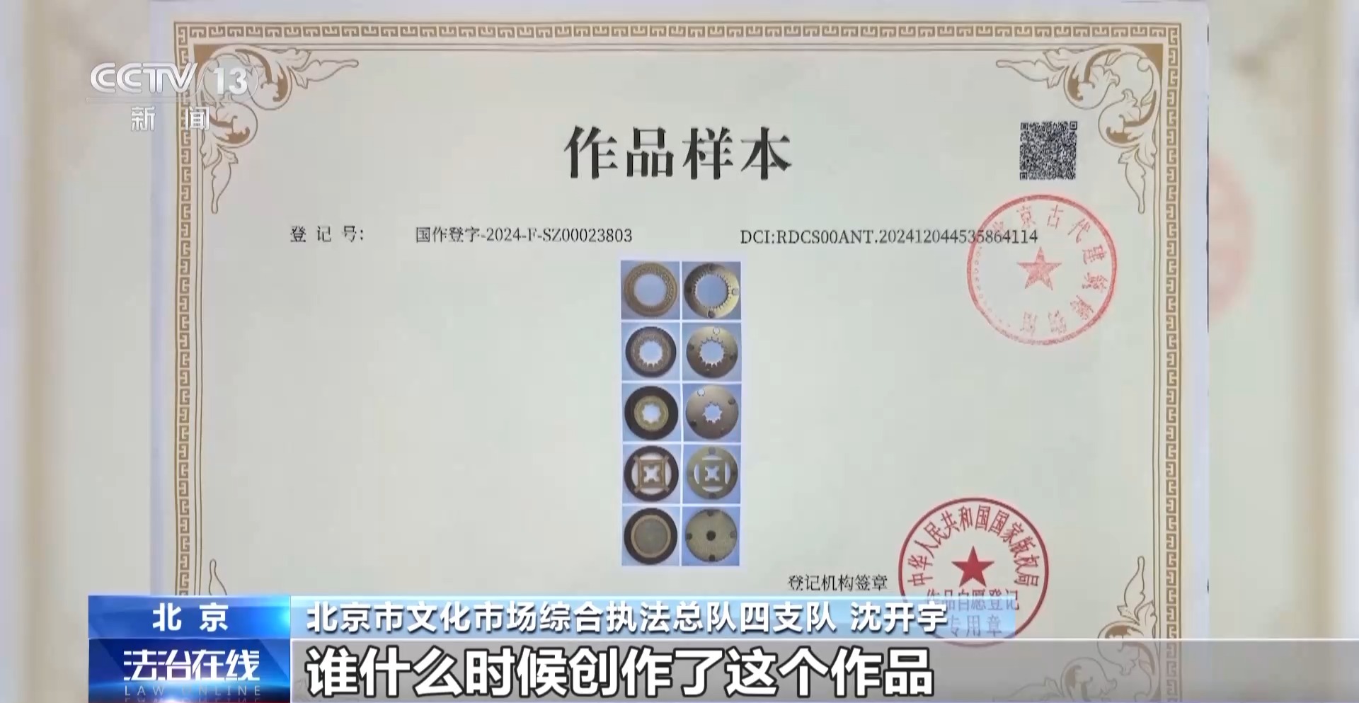 北京市文化市场综合执法总队四支队 沈开宇:这是一个美术作品,谁拥有美术作品的著作权,我们要看到底是谁创作了,谁什么时候创作了这个作品。创作冰箱贴的过程当中,他肯定有初版、定稿版,工厂生产的时候还有相应的委托合同,这些材料都证明了创作过程。但是我们再去调查被投诉单位,让他们提供相关的证明材料,证明他们创作了这个作品的时候,他们是提供不出来相关的资料的。