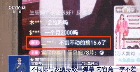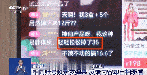 一个账号为“二XXX”的“消费者”先是发弹幕表示:“轻轻松松掉了35斤”,过一会儿又发弹幕说:“不饿不动,瘦了16.6。”