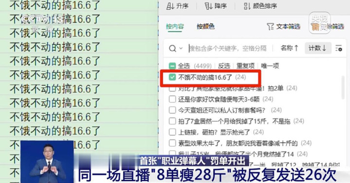 通过市场监管人员导出的一场直播的所有虚假弹幕,记者注意到,其中有大量重复发送的虚假弹幕内容:在同一场直播中“8单瘦28斤”被反复发送了26次,“不饿不动瘦16.6”被发送24次。